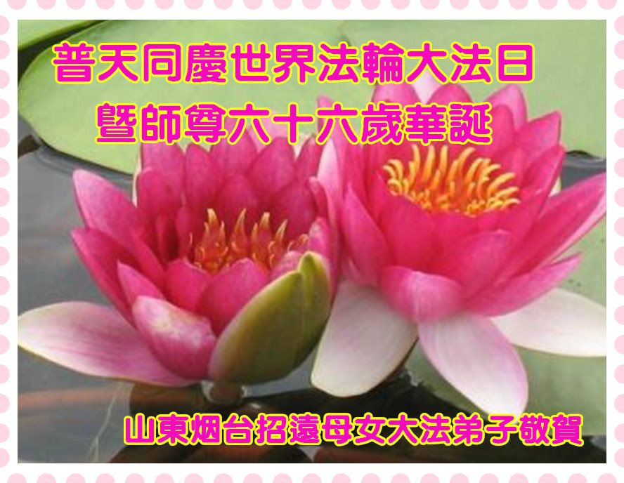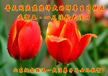慈悲伟大的师父您好:在普天同庆同祝五•一三世界法轮大法日之际,我们母女恭祝慈悲伟大的师父生日快乐!我们要学好法,修好自己,正念正行,努力做好三件事,多救人。感恩师父! 山东省烟台市招远市城北区大法弟子恭祝世界法轮大法日暨师尊华诞!