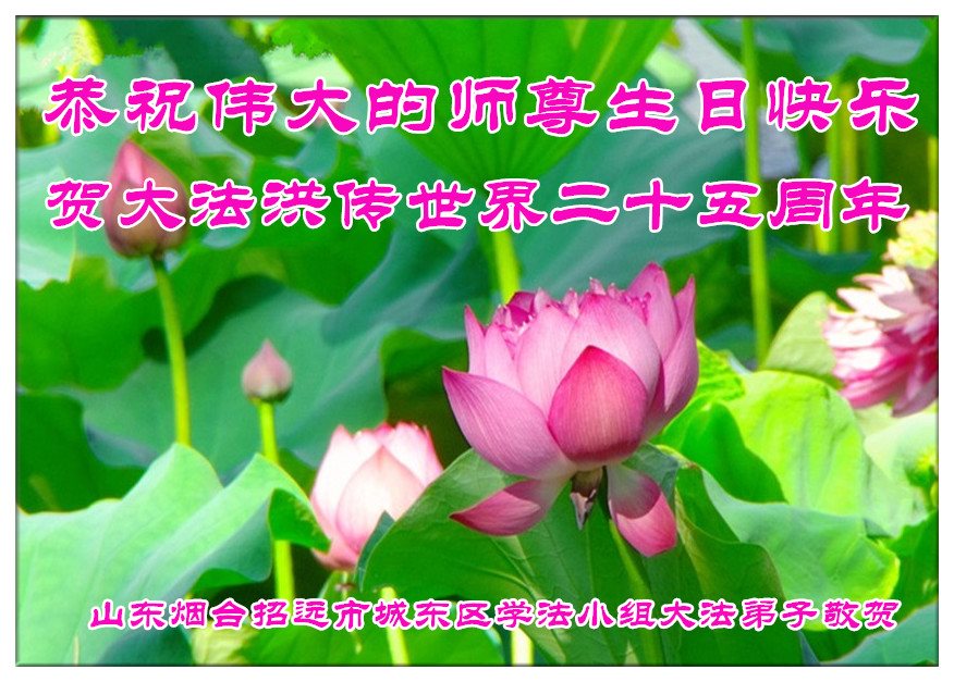 慈悲伟大的师尊您好:在天上人间同庆五•一三世界法轮大法日的大喜日子里,我们学法小组的全体大法弟子,怀着无比感恩、激动的心情:恭祝我们最伟大慈悲的师尊华诞快乐!弟子感恩师尊的慈悲救度,是师尊将弟子从地狱里捞起,将弟子满身的污浊洗净,一步一步的带着弟子走上了光明的道,每时每刻看护着弟子。请师尊放心,在以后所剩不多的日子里,不论时日长短,路途多么坎坷,弟子们都紧紧握住师尊的手,按照师尊的教导,继续做好弟子该做的三件事,兑现誓约! 山东烟台招远城东区两个学法小组大法弟子恭祝世界法轮大法日暨师尊华诞!
