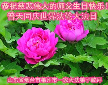 山东省烟台市莱州市一家大法弟子恭祝师父生日快乐!