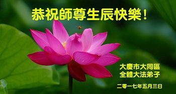 山西省大同地区一四人学法小组大法弟子恭祝慈悲伟大师父生日快乐!庆祝世界法轮大法日!