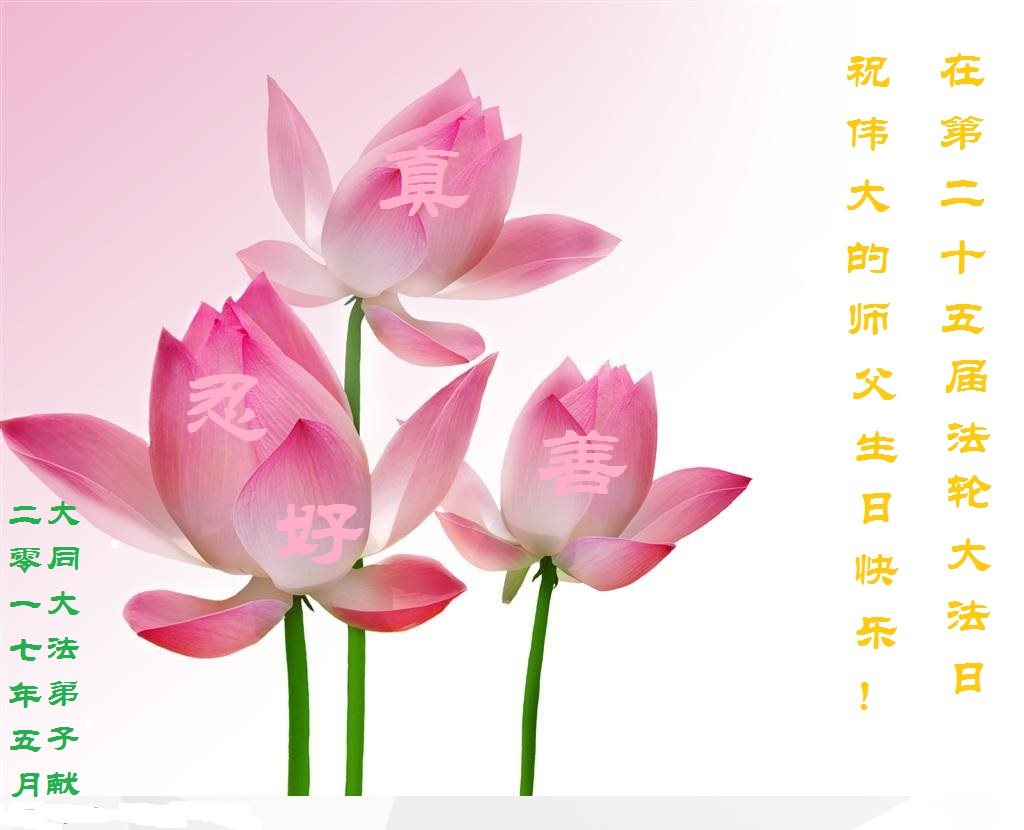 恭祝法轮大法洪传世间二十五载!在这寰宇、人间同庆的喜悦之日,我们五位大法弟子及家人们双手合十敬祝慈悲伟大的师尊华诞快乐!感恩师尊慈悲救度,使我们沐浴在师尊洪大的佛恩中!师尊为众弟子、为众生付出了巨大的承受,师尊您辛苦了!