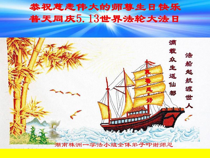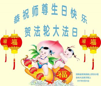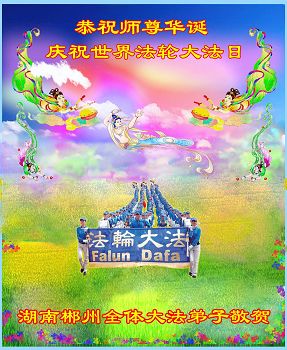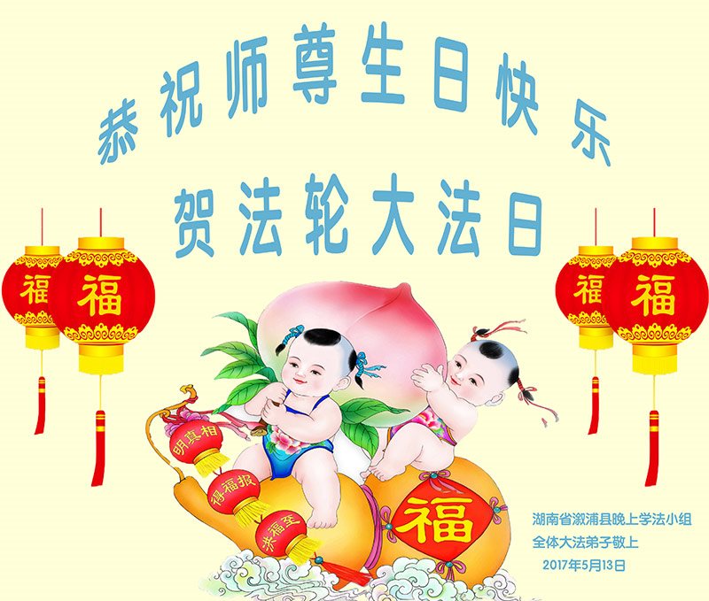 法轮大法好!普天同庆法轮大法洪传二十五周年! 伟大慈悲师父生日快乐! 湘潭学法小组大法弟子 合十 湖南溆浦一学法小组全体大法弟子恭贺法轮大法日