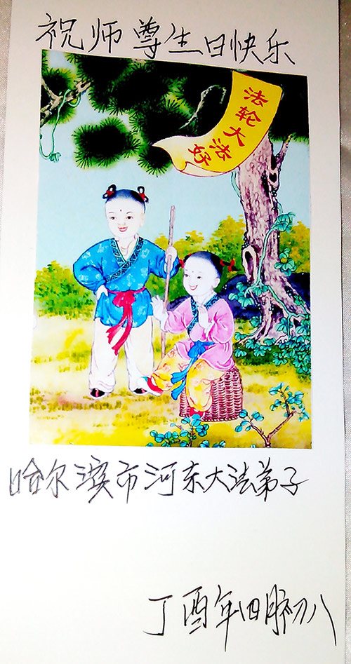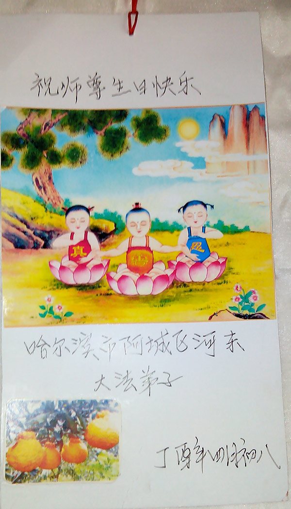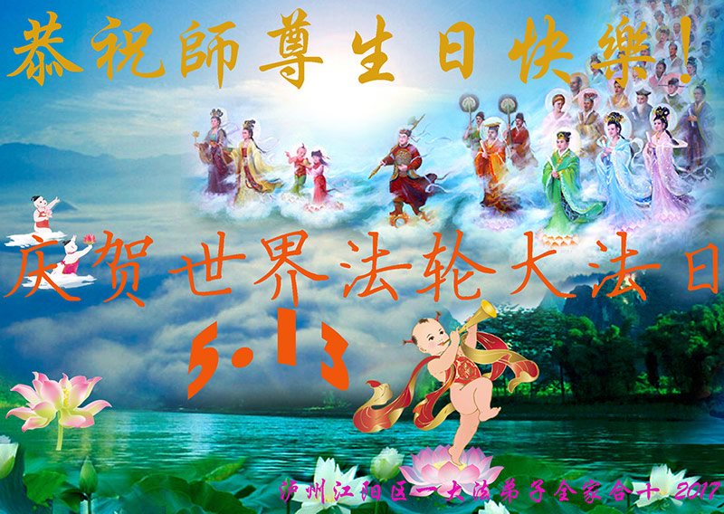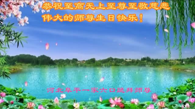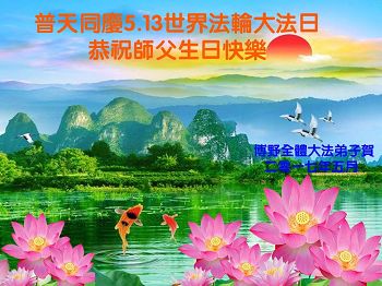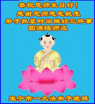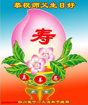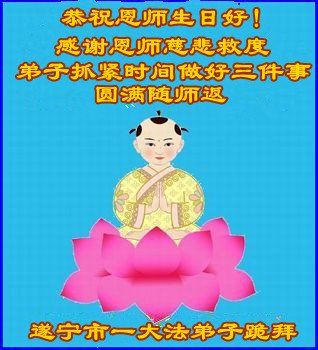 阿城大法弟子向慈悲伟大的师父感恩拜谢,以我们无限敬仰的感恩之心恭祝师尊生日快乐!弟子向您道一声:师父您好!师父您辛苦了!我们能在邪恶的迫害环境里走到今天,修炼向前的每一步、向上提高的每一层次,破除邪恶的每一次迫害,都体现着师尊对弟子生命与修炼机缘的珍爱与呵护。我们一定按照师尊的教诲,努力做好三件事,修好自己,救度世人、众生,让师尊多一份欣慰,少一份担忧,多一份自豪,少一份操劳。 四川遂宁市一大法弟子恭祝师尊生日快乐!庆祝世界法轮大法日!