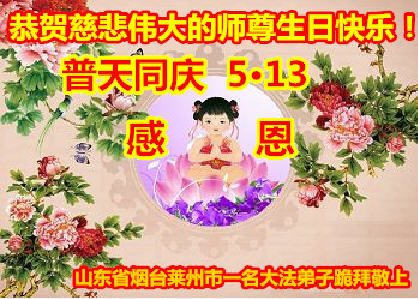 山东省烟台莱州市一名大法弟子恭祝慈悲伟大的师尊生日快乐!普天同庆5•13世界法轮大法日!
