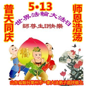山东省烟台莱州市一家大法弟子恭祝慈悲伟大的师尊生日快乐!普天同庆5•13世界法轮大法日!