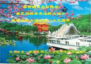 黑龙江省哈尔滨一家三代四人大法弟子恭祝师尊生日快乐!庆祝世界法轮大法日暨大法洪传二十五周年!