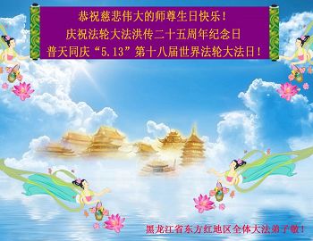 庆祝法轮大法洪传二十五周年纪念日! 普天同庆“5.13”第十八届世界法轮大法日! 黑龙江省东方红地区全体大法弟子敬 黑龙江省哈尔滨大法弟子恭贺世界法轮大法日暨师父生日快乐!