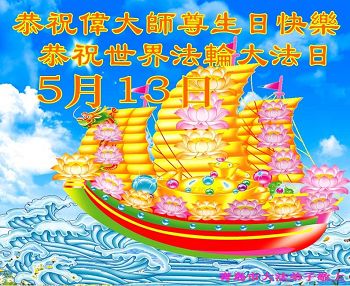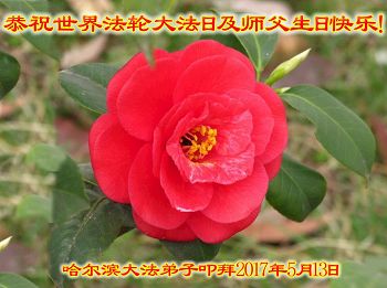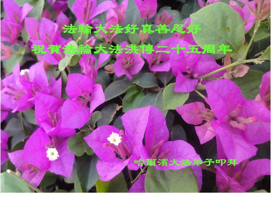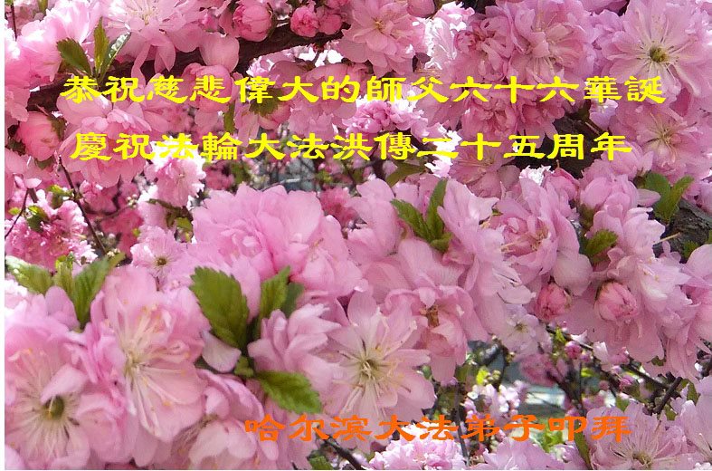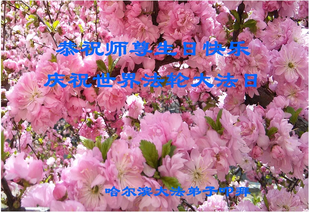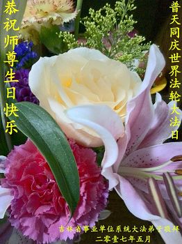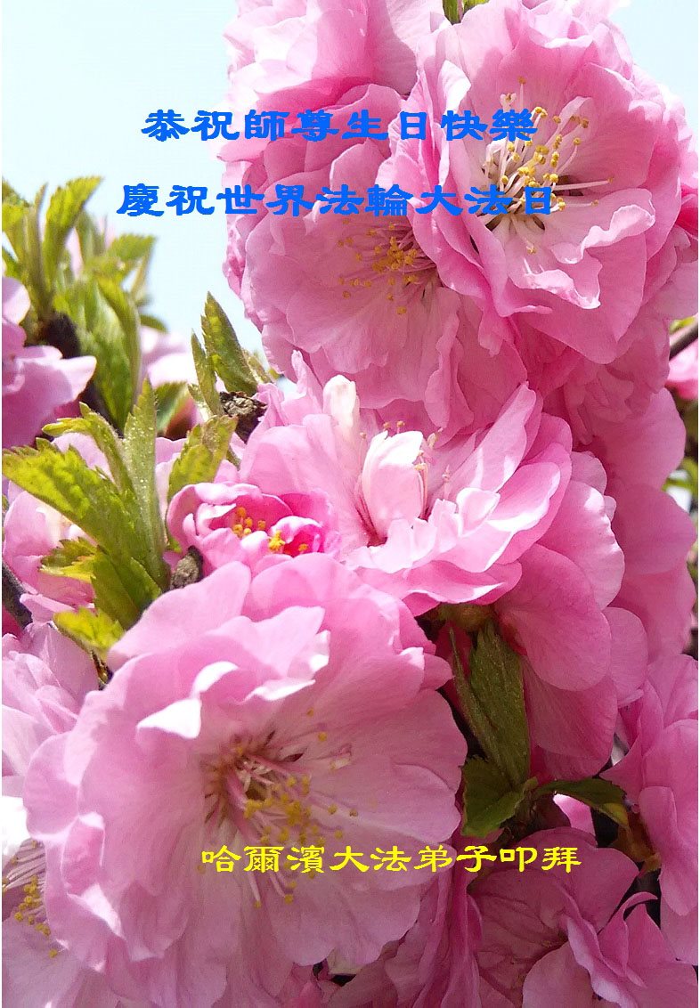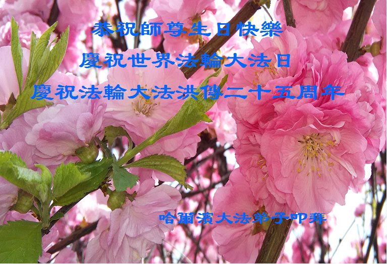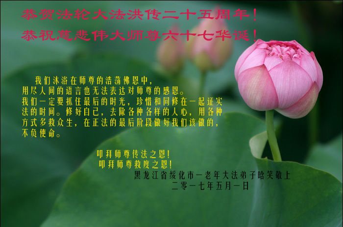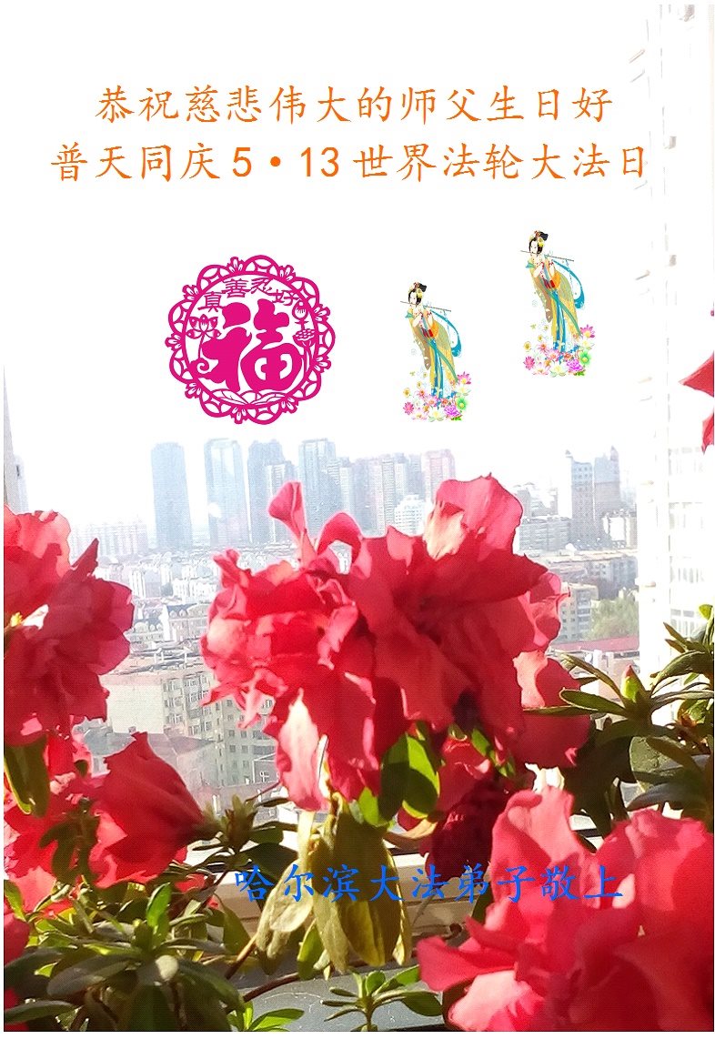 恭祝师尊生日快乐!普天同庆5·13世界法轮大法日!庆祝法轮大法洪传二十五周年!谢谢师父的呵护,感谢伟大师父慈悲救度之恩。弟子决心做好三件事,助师正法,圆满随师还。 哈尔滨大法弟子叩拜 吉林省一大法弟子恭贺法轮大法日!