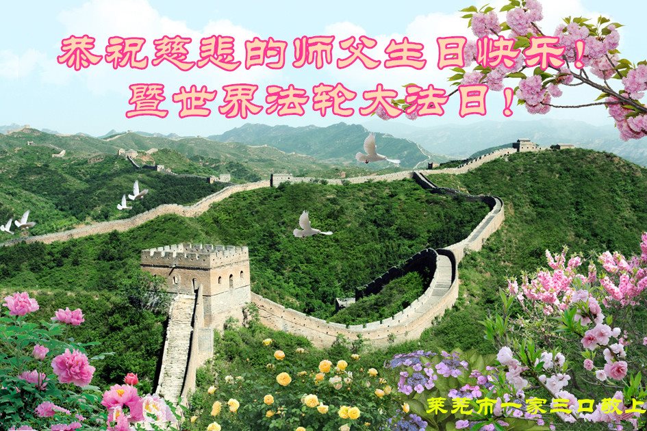 山东省莱芜市大法弟子一家三口恭祝慈悲的师父生日快乐!暨世界法轮大法日!