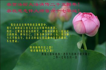 【明慧网二零一七年五月十日】 黑龙江省绥化市一老年大法弟子恭祝慈悲伟大的师尊生日快乐!
