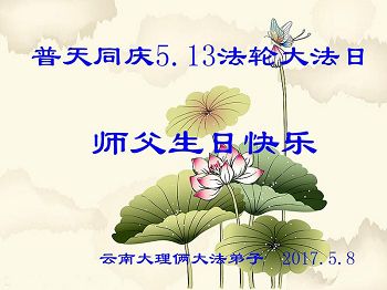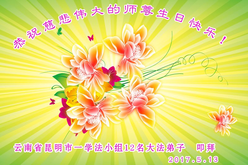 时光的车轮走入二零一七年五月十三日,这是一个光辉的节日—法轮大法洪传世界二十五周年暨师父六十六华诞!云南省昆明市官渡区部份大法弟子恭贺世界法轮大法日暨师父华诞!