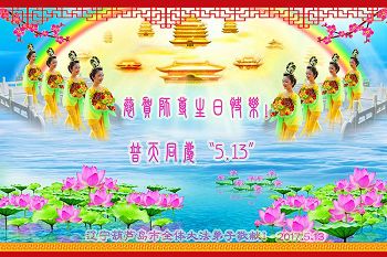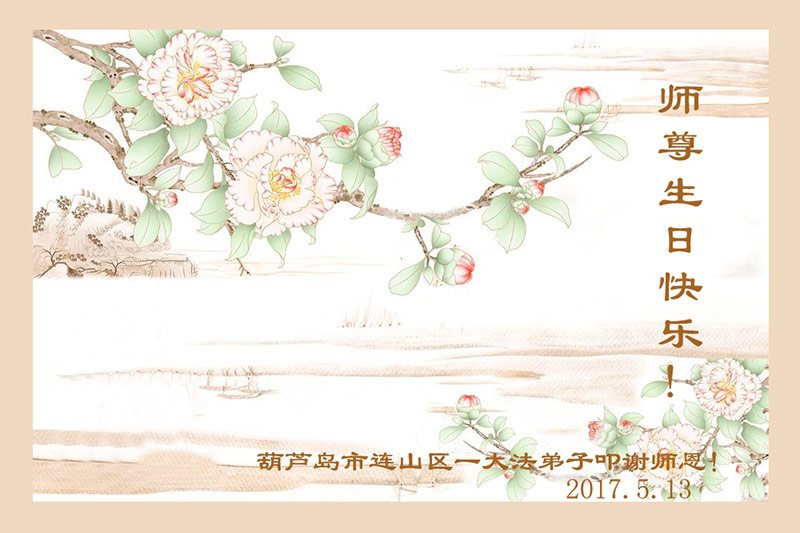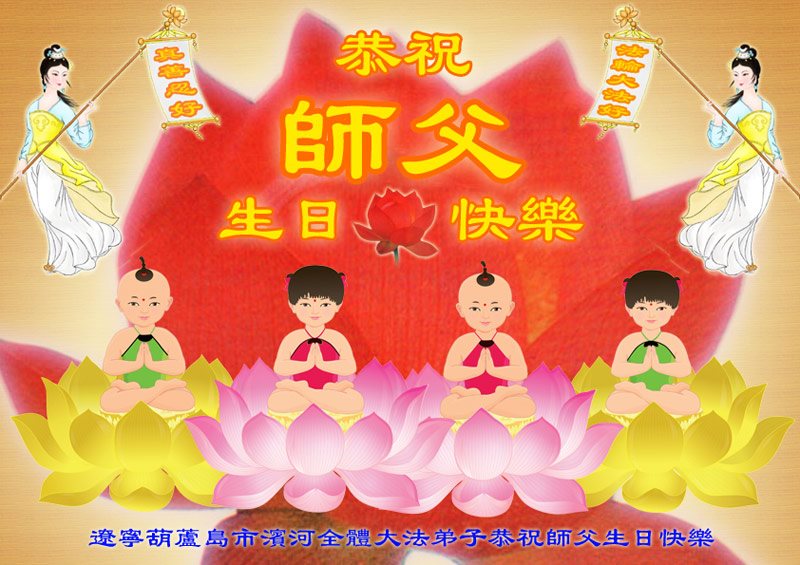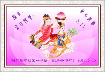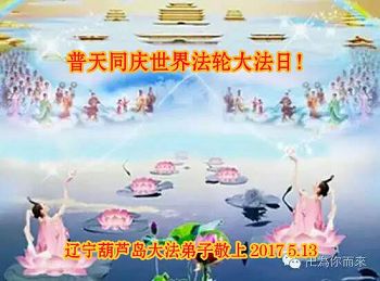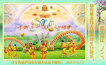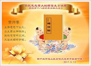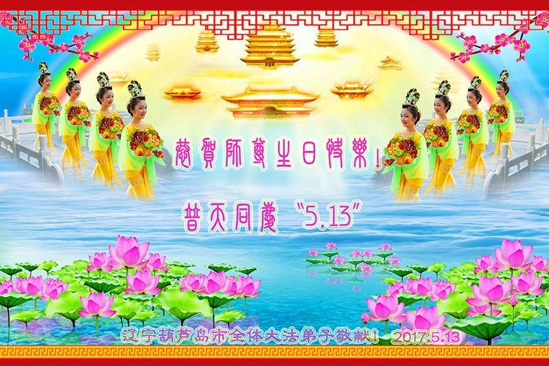 在普天同庆的5.13世界法轮大法日即将到来之际,葫芦岛地区全体大法弟子敬祝师尊:祝师父生日快乐!为了救度宇宙苍穹众生,为了救度弟子,慈悲的师父啊,您辛苦了!弟子们一颗无限感恩的心,向师父说:“谢谢师父!”永远感恩师尊,永远坚定的跟着师父向前走。
