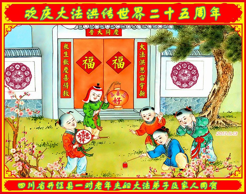 【明慧网二零一七年五月十一日】 四川省达州市开江县一对老年夫妇大法弟子及家人欢庆大法洪传世界二十五周年!