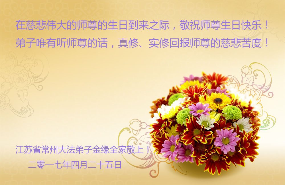 法轮大法好 真 善 忍 好 江苏常州地区一大法弟子叩拜 江苏省常州市大法弟子金缘全家恭祝慈悲伟大的师尊生日快乐!