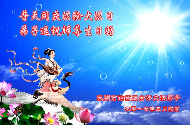 法轮大法传世界 洪恩撒遍苍宇间 缘归圣果上穹苍 得法修行出世间 江苏省苏州市姑苏区全体大法弟子普天同庆法轮大法日!弟子遥祝师尊生日好!