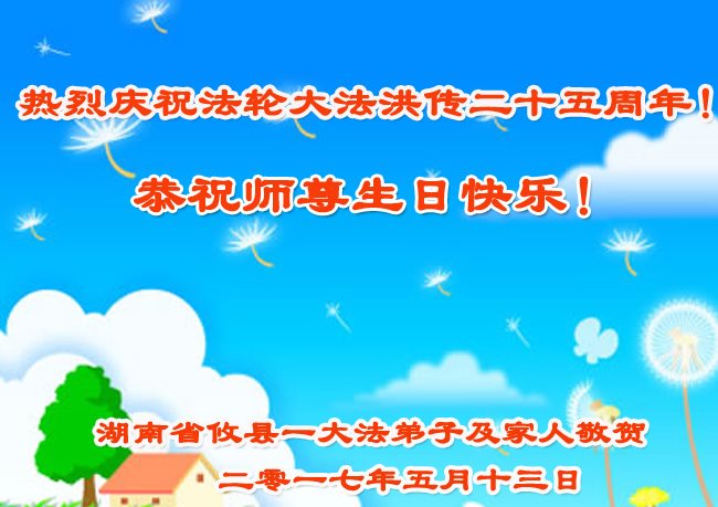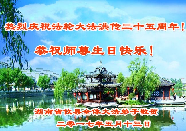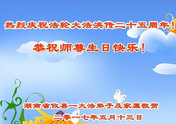 湖南省攸县一大法弟子全家恭贺法轮大法洪传二十五周年,恭祝师尊生日快乐! 湖南溆浦全体大法弟子恭贺法轮大法日!