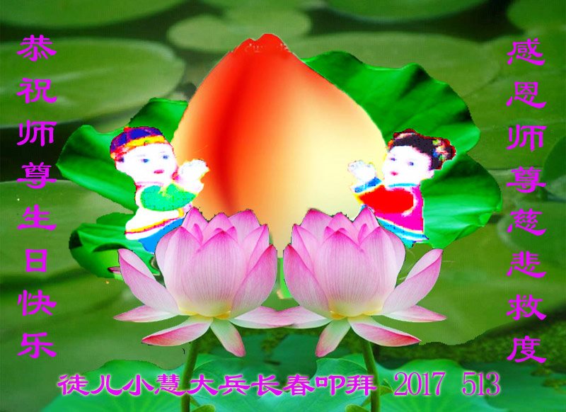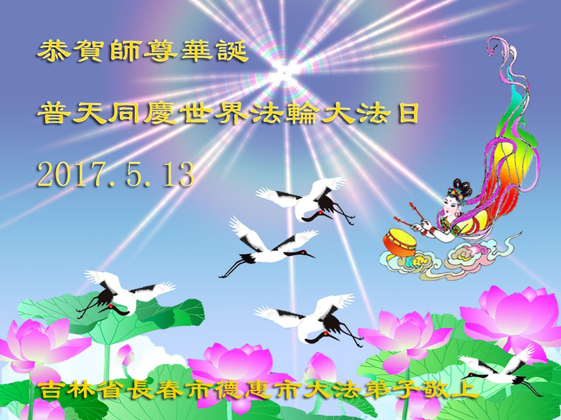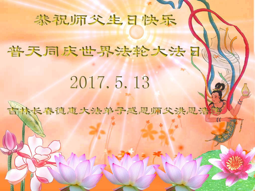 弟子在抓紧做好三件事的喜悦中,又迎来了2017年的法轮大法日及师尊的华诞。在正法形势突飞猛進的鼓舞中,我们定要抓住正法最后机会修好自己,多救世人,以报师恩。 吉林省长春大法弟子恭祝慈悲伟大的师尊生日快乐!