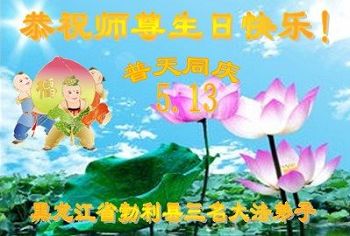 黑龙江省大兴安岭松岭夫妻大法弟子及5岁孙子恭祝法轮大法洪传25周年,普天同庆第18个世界法轮大法日暨慈悲伟大的师尊66岁华诞! 师父我们想念您!谢谢师父的慈悲苦度,盼望师父能早日回大陆,我们一定会听师父的话,做好三件事,救度众生。 黑龙江省七台河市勃利县三名大法弟子庆祝5.13!恭祝慈悲伟大的师尊生日快乐!叩拜谢师恩!