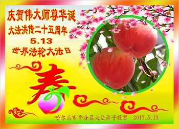 【明慧网二零一七年五月十一日】 黑龙江哈尔滨市平房区大法弟子恭祝师尊华诞暨大法洪传二十五周年!