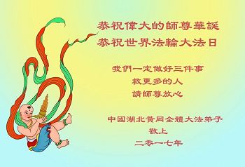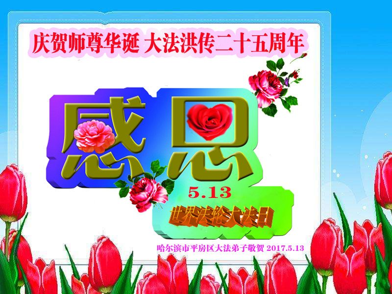 庆贺师尊华诞!庆贺世界法轮大法日!庆贺大法洪传二十五周年! 哈尔滨市平房区大法弟子敬贺 2017.5.13 四川成都一大法弟子全家恭祝师尊生日快乐!恭贺法轮大法日!