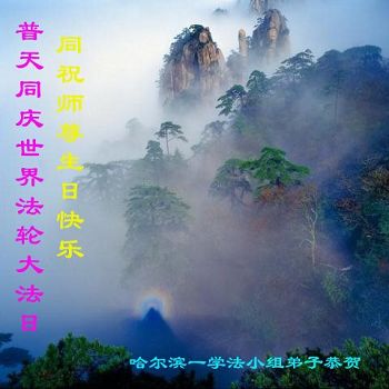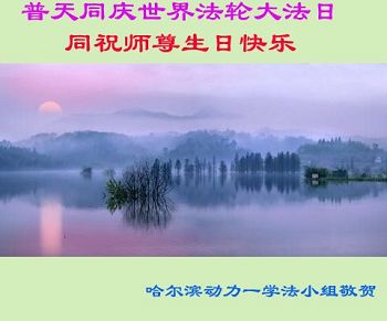 普天同庆世界法轮大法日,同祝师尊生日快乐! 哈尔滨一学法小组弟子恭贺! 黑龙江哈尔滨动力一学法小组恭祝普天同庆世界法轮大法日!同祝师尊生日快乐!