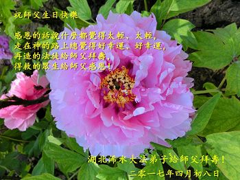 做好三件事,听师尊话走好最后的路,跟师尊回家。 长春大法弟子敬上 2017年4月5日 天津大法弟子与姐弟同修恭祝师尊生日快乐!恭贺法轮大法日!
