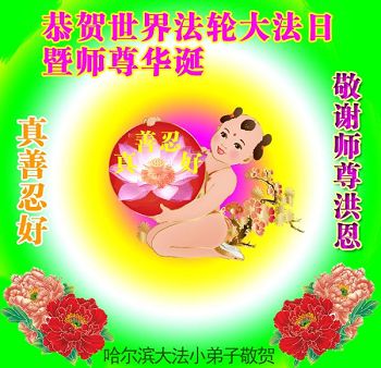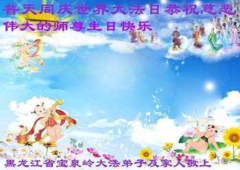 学法得法 修炼无价 身体健康 思想升华 去掉自我 真善忍同化 生命永恒 目标远大 多救世人 助师正法 感谢师尊 感谢大法 佳木斯大法弟子 黑龙江佳木斯大法弟子恭祝伟大师尊生日快乐!并祝贺世界法轮大法日!