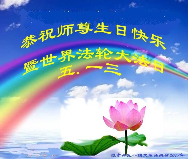 尊敬的师父您好: 光阴似箭,转眼间二零一七年五月十三日,伟大的师尊的生日即将到来,弟子恭祝师尊生日快乐! 弟子一定紧跟师尊的正法進程,努力做好三件事,努力多救人,向内找修好自己,无论身体承受多大的魔难,也一定坚修大法到底,跟师父回家。 谢谢师父!谢谢师父的慈悲呵护与救度! 山东烟台市龙口市大法弟子 二零一七年四月二十日 山东烟台市龙口市大法弟子恭祝师父华诞暨世界法轮大法日!
