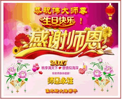 慈悲伟大的师父:您好!弟子恭祝恩师六十六岁生日快乐!跪拜恩师。 弟子唯有做好三件事,多救人,让恩师多欣慰。 中国大陆山东烟台市龙口市大法弟子 二零一七年四月二十日 山东烟台市龙口市大法弟子恭祝师父华诞暨世界法轮大法日!