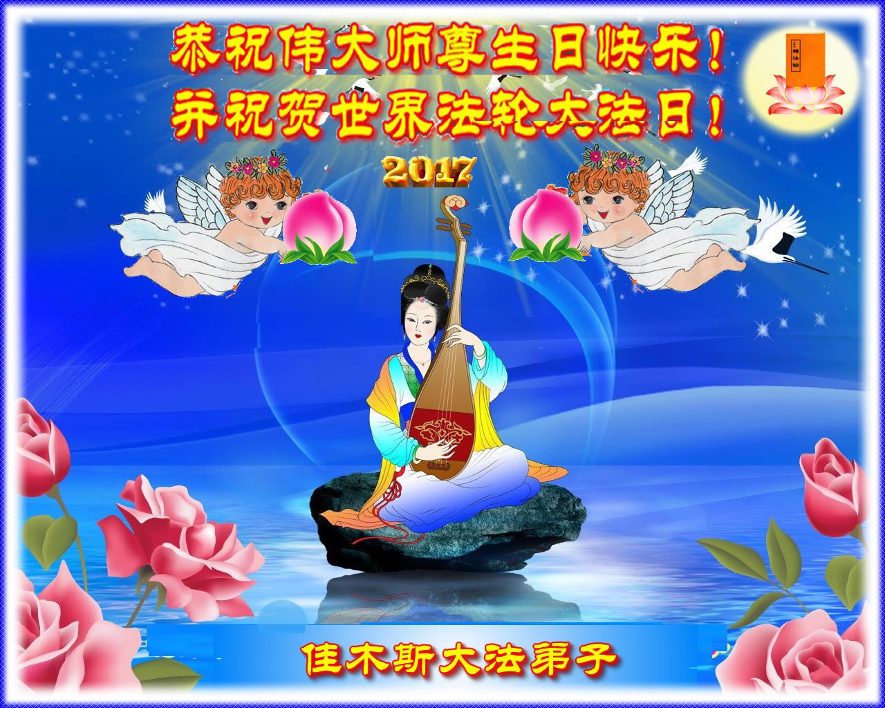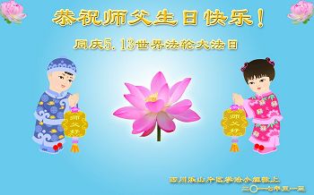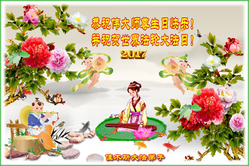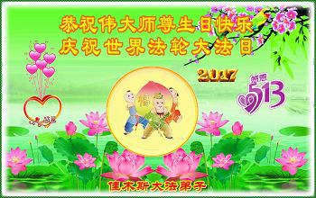 慈悲伟大的师父:您好!五月十三日既是师父的生日,又是世界法轮大法日。在这神圣而幸福的日子里,我们三位老年女大法弟子,从内心恭祝您:慈悲伟大的师父生日快乐!合十! 在这普天同庆的感恩之日,弟子们感恩师父的救度之恩,感恩师父时时事事无微不至的看护着弟子们修炼。弟子们一定要听师父的话,多学法,学好法,遇事找自己,实修自己,努力做好三件事,做师父的真修弟子,兑现自己来世的誓约,圆满跟师父回家。 山东烟台市招远市大法弟子 二零一七年四月二十日 四川省成都大法弟子恭祝师尊生日快乐!恭贺第十八届世界法轮大法日!
