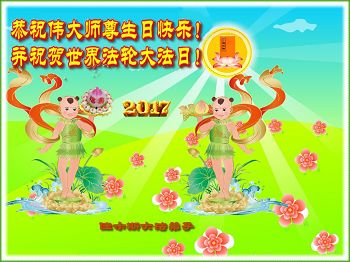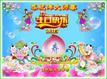 尊敬的师父:您好! 在5月13日师父您的生日和世界法轮大法日即将到来之际,我们学法小组全体大法弟子恭祝师尊生日快乐!恭贺第十八届世界法轮大法日! 同时,为了表达我们对师尊的崇高敬意与感恩,我们学法小组全体大法弟子决心在这最后的日子里,一定遵照师尊的教诲,一如既往的把该做的三件事尽力尽量做好,迎接普天同庆的那一天。 叩谢恩师!双手合十! 成都一学法小组全体大法弟子敬上 二零一七年四月二十日 北京昌平一大法弟子恭祝师尊生日快乐!