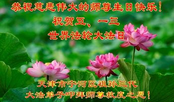 天津市宁河区祖孙三代大法弟子恭贺大法日!恭祝师尊生日快乐!