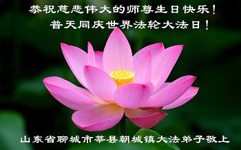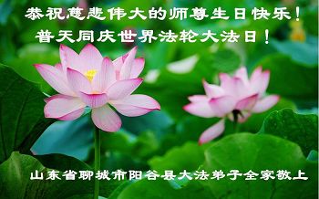 山东省聊城市阳谷县大法弟子全家恭祝师尊生日快乐!