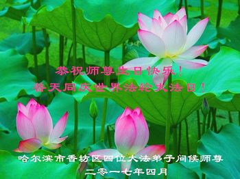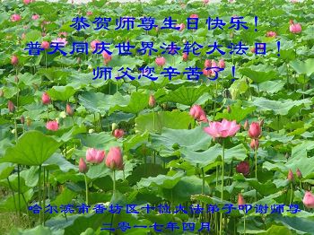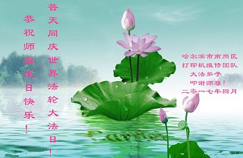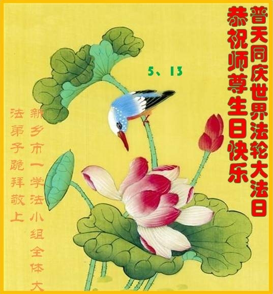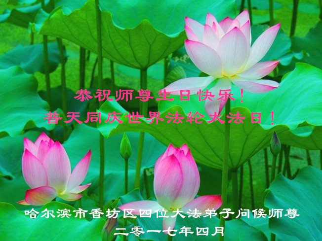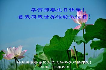 普天同庆世界法轮大法日!恭祝师尊生日快乐! 弟子只有坚修、实修做好师父交待的三件事。让师父多一份欣慰,少一份操劳,才能对的起师父的苦度,兑现自己的誓约,圆满随师还。 新乡市一学法小组全体大法弟子叩谢师恩 黑龙江省哈尔滨市香坊区四位大法弟子恭祝师尊生日快乐!