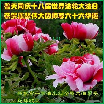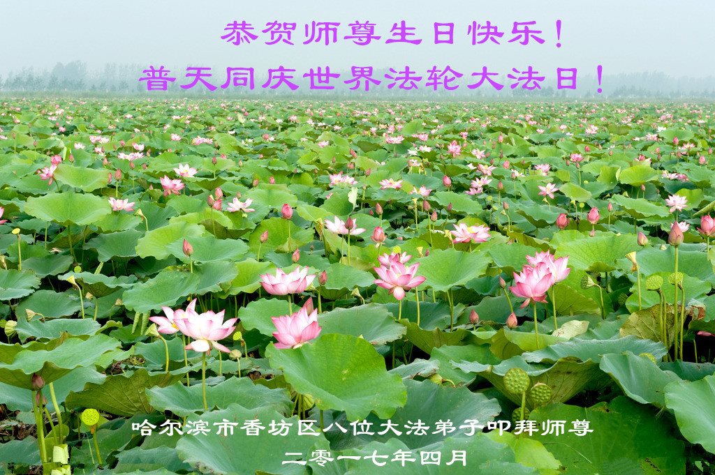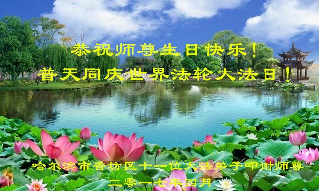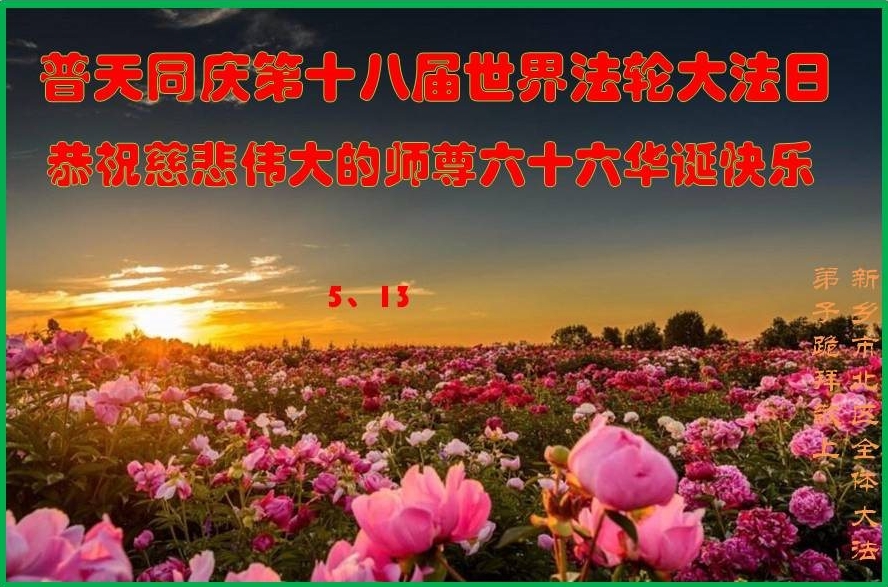 普天同庆第十八届世界法轮大法日! 恭祝慈悲、伟大的师尊六十六华诞快乐! 十八年风云变幻的正法修炼之路,一点一滴都是师尊慈悲看护,弟子叩拜师恩。在最后的修炼路上,弟子一定以法为师,改变人的观念,做好三件事,精進实修,完成史前大愿。 新乡市北区全体大法弟子叩谢师恩 黑龙江省哈尔滨市香坊区八位大法弟子恭祝师尊生日快乐!