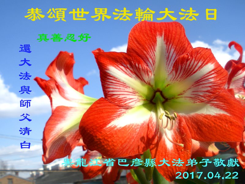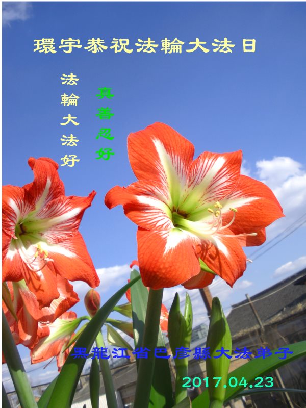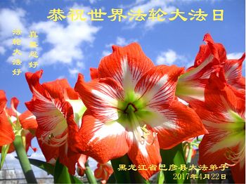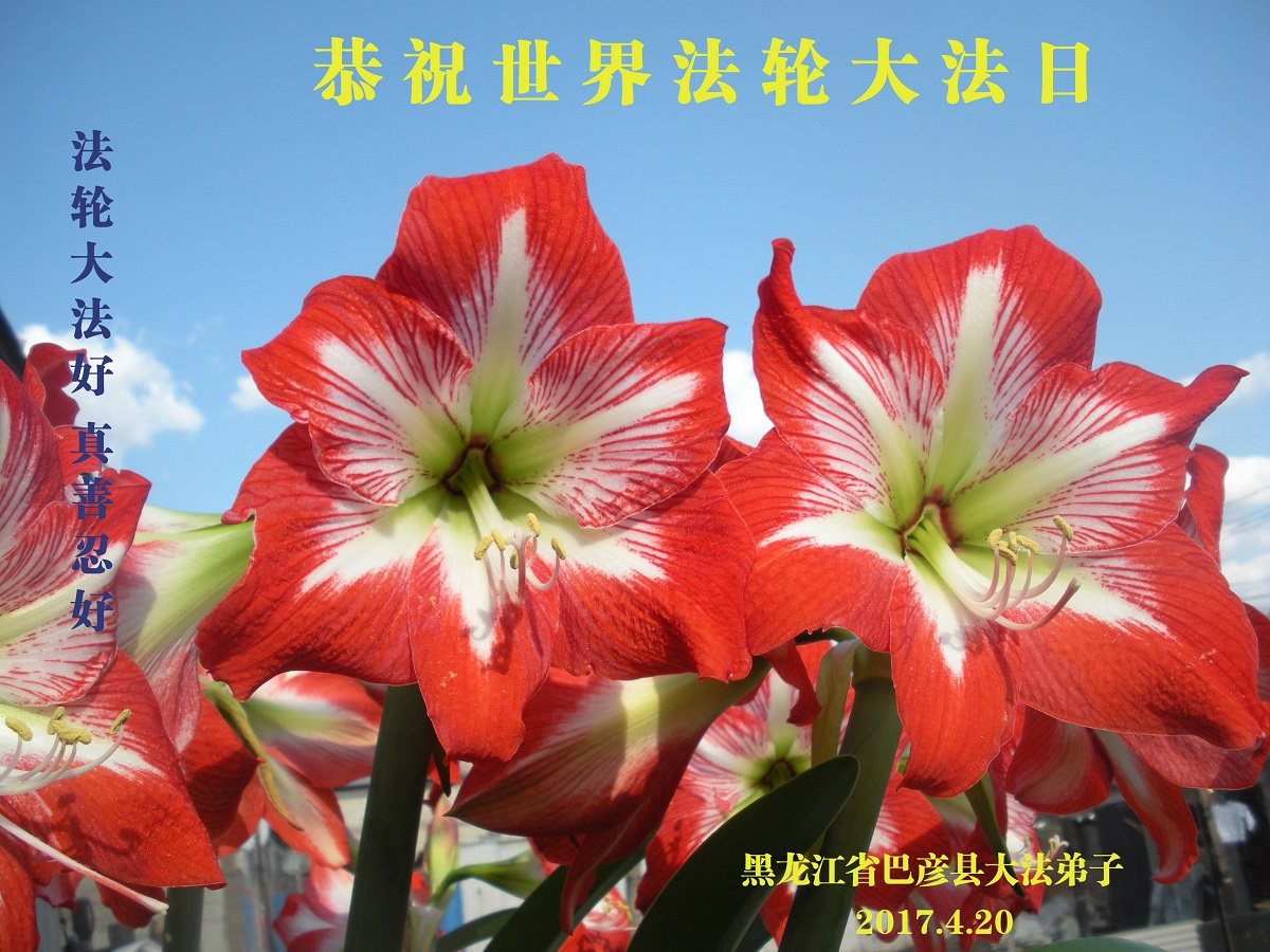 2017年的法轮大法日就要到了,我们夫妻大法弟子恭贺大法日及大法师尊生日快乐! 祝愿所有的大法弟子珍惜助师正法的最后时刻,勇猛精進做好三件事,跟师父回家! 我们的图片是用自己家开的对对红花图片,开得非常绚丽圆满,欣欣向荣!寓意积极向上。 黑龙江省巴彦县一弟子全家向师尊叩首! 2017.04.24 山东省淄博市全体大法弟子恭祝至尊至上慈悲伟大的师尊六十六华诞暨第十八届世界法轮大法日!