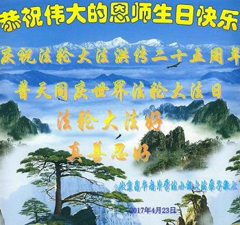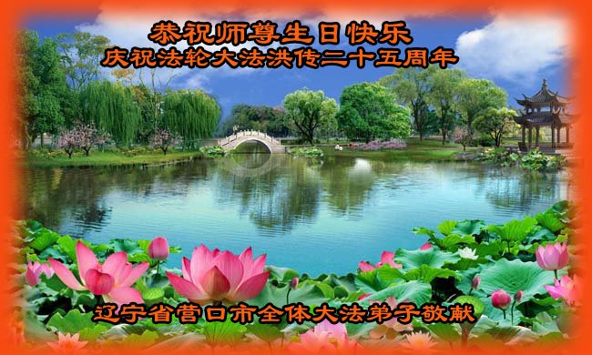 弟子一定修炼好自己,兑现着千万的誓约,做好三件事。多救人,这是师尊对大法徒的无量慈悲和苦度。走好最后的路,盼望师尊早日回来,让师尊少操心,多一点欣慰,感恩师尊的慈悲苦度! 2017年4月24日 辽宁省营口市全体大法弟子恭祝师尊生日快乐!庆祝法轮大法洪传二十五周年!
