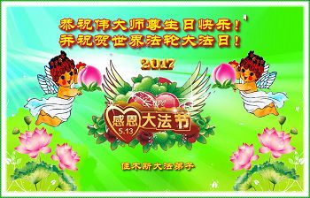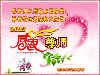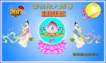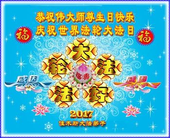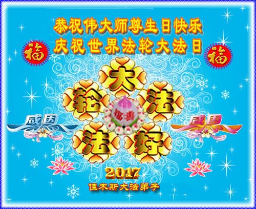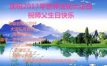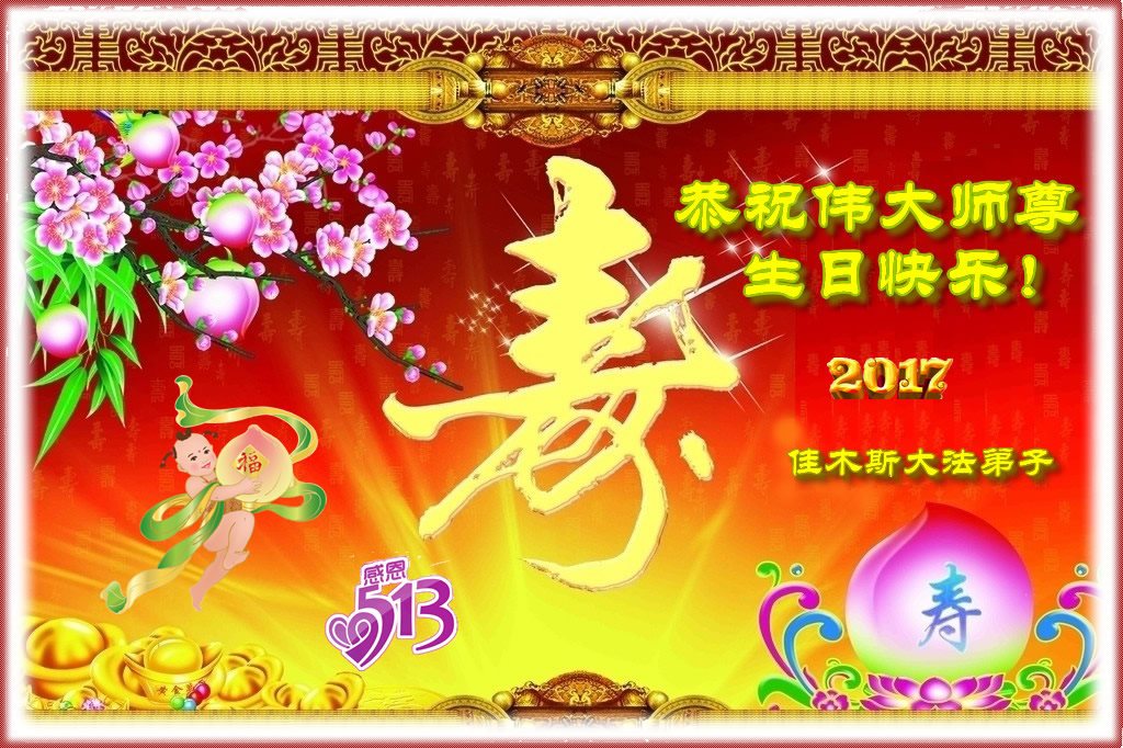 法轮大法 佛光普照 师恩浩荡 无以回报 晚年得法 疾病全消 真修大法 人生正道 助师正法 争分夺秒 众生得救 邪恶除掉 叩首师父 苦心操劳 祝师快乐! 师恩永报 佳木斯大法弟子 2017.5.13。 黑龙江佳木斯大法弟子恭祝伟大师尊生日快乐!并祝贺世界法轮大法日!