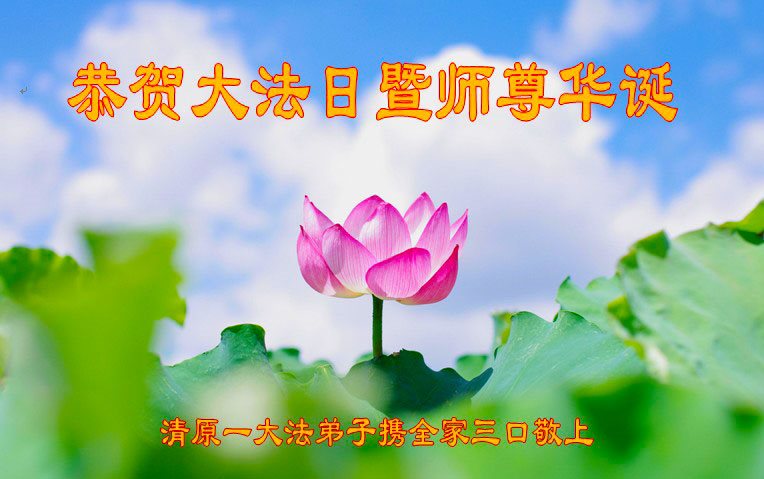 辽宁省抚顺市清原县一大法弟子携全家三口恭贺世界法轮大法日!恭祝师尊生日快乐!