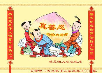 天津大法弟子全家恭祝慈悲伟大的师尊生日快乐!