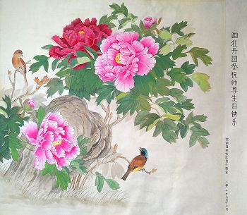 (工笔画牡丹图,宽70公分,長64公分) 黑龙江八五四农场一学法小组恭贺世界法轮大法日!