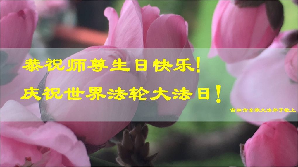 一年一度大法日即将来临,我们全家感恩大法师父把我们从常人最苦的环境中解脱出来,领我们走上了返本归真的修炼大道,让我们记起那久远的誓言,使我们懂得了为什么来到人间——千千万万年漫长的等待,只为能踏上回归的法船。在回归的路上我们体验着大法的神奇,同时在归正着自己,助师救度着众生。大法给众生带来无限生机、无限希望。我们沐浴着浩荡佛恩,体味到从来未有过的快乐!和幸福,生存的有价值、有意义。我们回报师尊最好的方法就是:坚定信念,做好三件事,一修到底,跟师父回家。谢师尊慈悲救度! 吉林市一大法学习小组全体弟子恭祝师尊生日快乐!