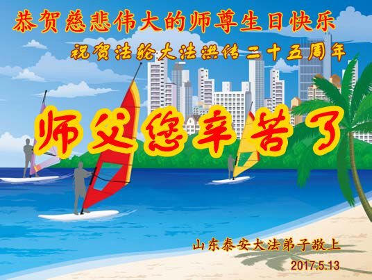 师尊您好!我们修炼都已经二十多年了,在师尊和大法蒙冤、被诬陷时,我们都曾以身护法,捍卫宇宙真理。值此法轮大法洪传二十五周年之际,我们怀着无比崇敬的心情恭祝师尊生日快乐!我们定抓紧时间做好三件事,多救人。请师尊放心,我们一定兑现誓约,不辱历史使命!全体弟子叩拜师尊!合十 山东泰安大法小弟子恭贺慈悲伟大的师尊生日快乐!