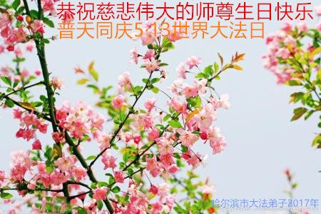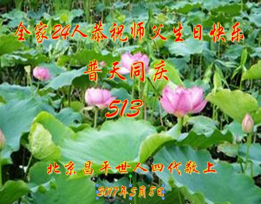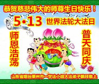 又是五、一三到来,弟子们怀着高兴而又激动的心情迎来了这伟大的节日。谢谢师尊的无量洪恩!弟子们用尽人类的语言也无法表达对师尊的感恩与思念,只有在未来的不多的时间里救度更多的众生以报师恩。唐县全体大法弟子敬上! 辽宁大连家庭学法四人小组恭祝慈悲伟大的师父生日快乐!普天同庆世界法轮大法日!