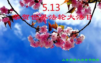 山东省潍坊市高密市一大法弟子恭贺世界法轮大法日!恭祝师父生日快乐!恭贺法轮大法传世25周年!