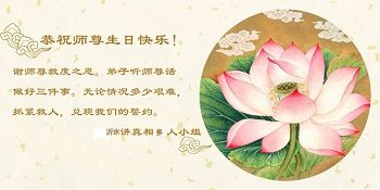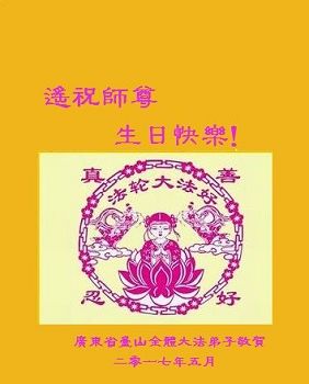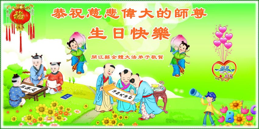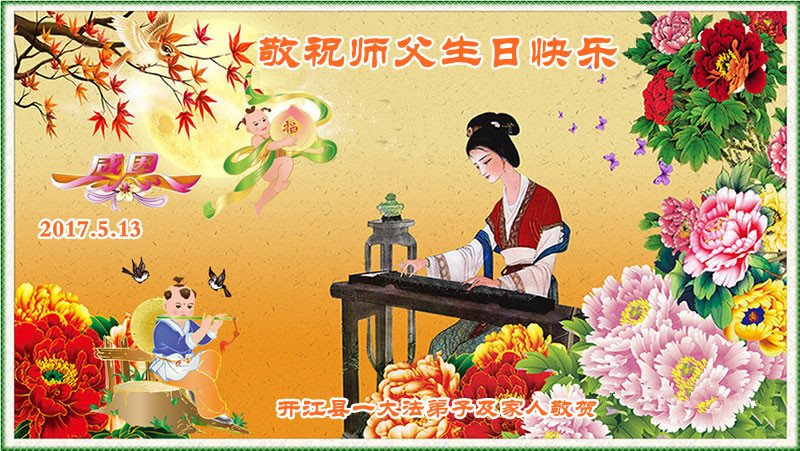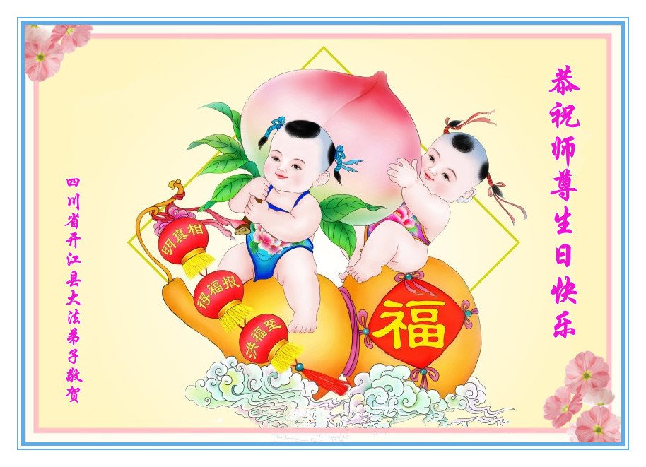 我们小组全体大法弟子恭祝慈悲伟大的师父生日快乐!恭贺世界法轮大法日的到来!同庆法轮大法洪传二十五周年!我们一定走好走正今后的路,尽力做好三件事。 栖霞市一个学法小组的全体大法弟子敬上 四川省达州市开江县大法弟子恭祝师尊生日快乐!