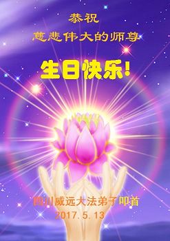 祝贺五一三世界法轮大法日!庆祝法轮大法洪传世界二十五周年! 感谢师父的慈悲救度,我一定要跟上师父的正法進程,精進做好三件事,敬师敬法,走好最后的正法之路,兑现我们神圣的誓约。谢谢师父!法轮大法好!真善忍好! 二零一七年五月八日 北京市丰台区大法弟子恭祝慈悲伟大的师父生日快乐!