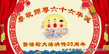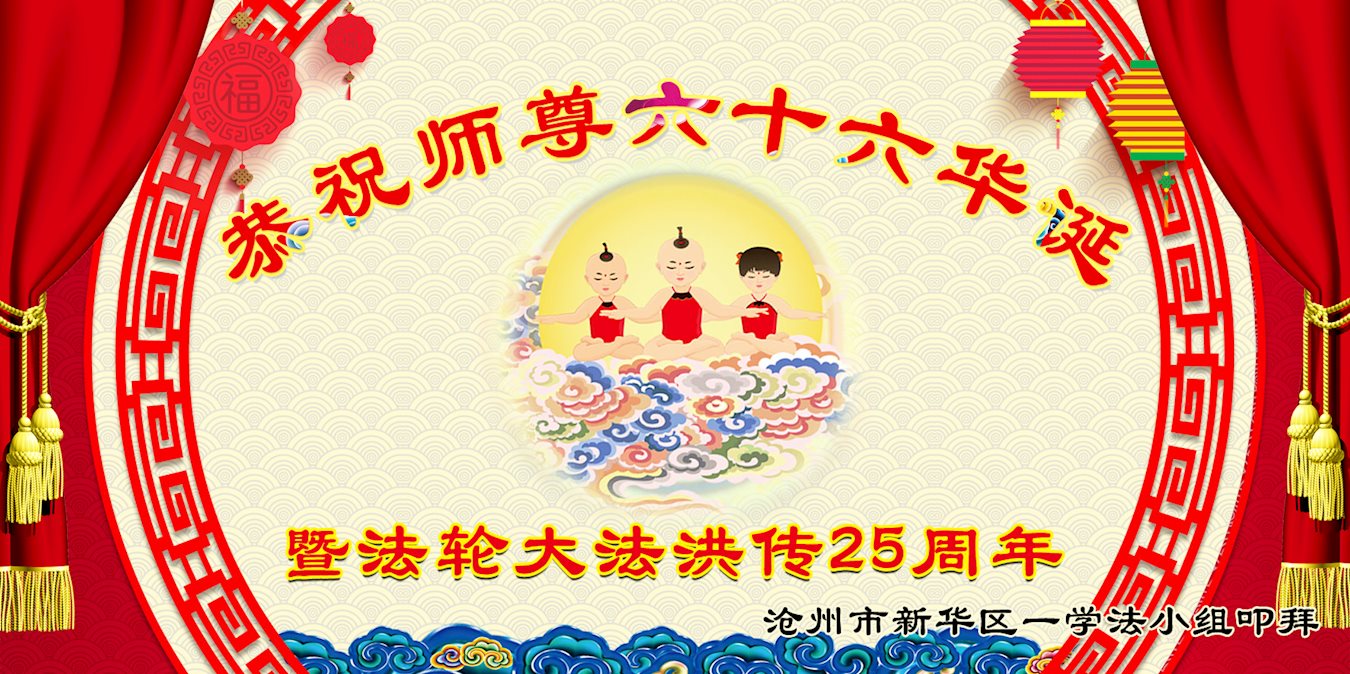 值此法轮大法洪传二十五周年之际,恭祝师尊六十六岁华诞,普天同庆世界法轮大法日! 河北省沧州市新华区一学法小组大法弟子叩拜 吉林省辽源市东丰县大法弟子恭贺法轮大法日!