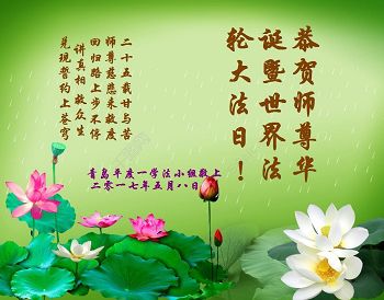 恭贺世界法轮大法日! 恭祝慈悲伟大的师尊生日快乐! 大连一学法小组全体大法弟子敬上 二零一七年五月八日 北京居住的一河北大法弟子恭祝师尊华诞!恭贺法轮大法日!