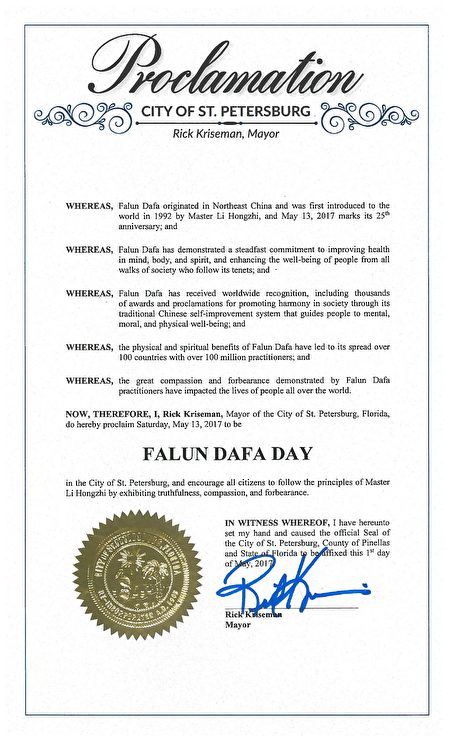 | 【明慧网二零一七年五月十一日】二零一七年五月十三日是法轮大法洪传二十五周年纪念日,也是第十八届“世界法轮大法日”。美国佛罗里达圣彼得堡市(St Petersburg)市长Rick Kriseman宣布五月十三日为该市法轮大法日,并鼓励全体市民遵循真善忍的原则。 褒奖状译文如下: 鉴于,法轮大法于一九九二年由李洪志大师在中国东北传出,二零一七年五月十三日是法轮大法洪传二十五周年; 鉴于,法轮大法增进人们的身心健康,提升人们的精神,已给各行各业的修炼者带来健康和福祉; 鉴于,法轮大法通过中国传统的自我修炼提高体系,引导人们提升道德、并带来身心健康和福祉,从而使得社会安定和睦,因而在全世界范围内广受赞誉,得到了成千上万的奖励和褒奖。 鉴于,法轮大法对人们身心的提高, 使得法轮大法传遍了全世界一百多个国家,惠及一亿多民众; 鉴于,法轮大法修炼者所表现出来的大善和大忍对全世界人们的生活产生了影响; 因此,我,Rick Kriseman, 圣彼得堡市市长,褒奖2017年5月13日为圣彼得堡的法轮大法日,并鼓励全体市民遵循李洪志大师所倡导的真善忍原则。